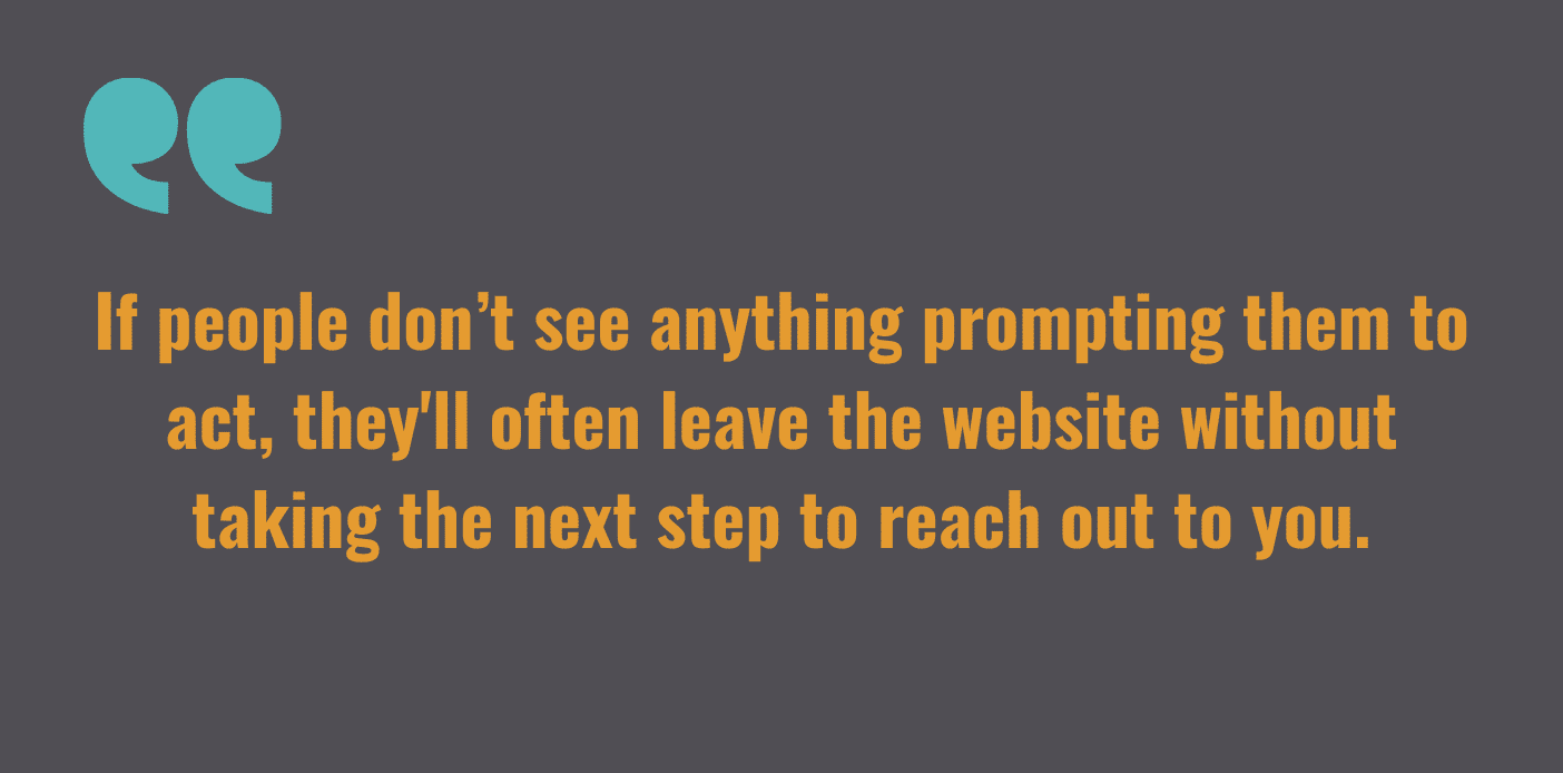 One of the most common things that websites fail to feature is a prominent Call to Action button (or a CTA button). If people don’t see anything prompting them to act, they'll often leave the website without taking the next step to reach out to you. Buttons should be prominently placed, match the rest of your colors/branding, and give people clear direction.