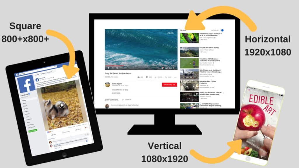 Now, here’s where the content multiplication magic really starts. You’ll need to edit your video into multiple versions that fit the ideal size and dimensions for each social media platform. YouTube still runs on the traditional landscape format, so save a version with the dimensions of 1920x1080. For Facebook and Instagram, the square video is king. In a case study, square videos resulted in up to 30-35% higher video views and an 80-100% increase in engagement. Instagram TV is in its own category since it will only accept vertical videos. You’ll need to crop one version of your video into 1080x1920 vertical format. Keep in mind that Instagram TV’s time caps out at 10 minutes.